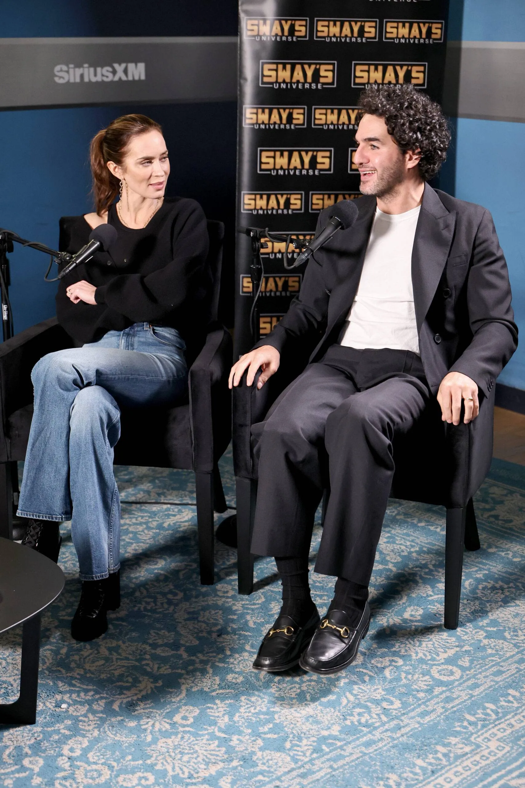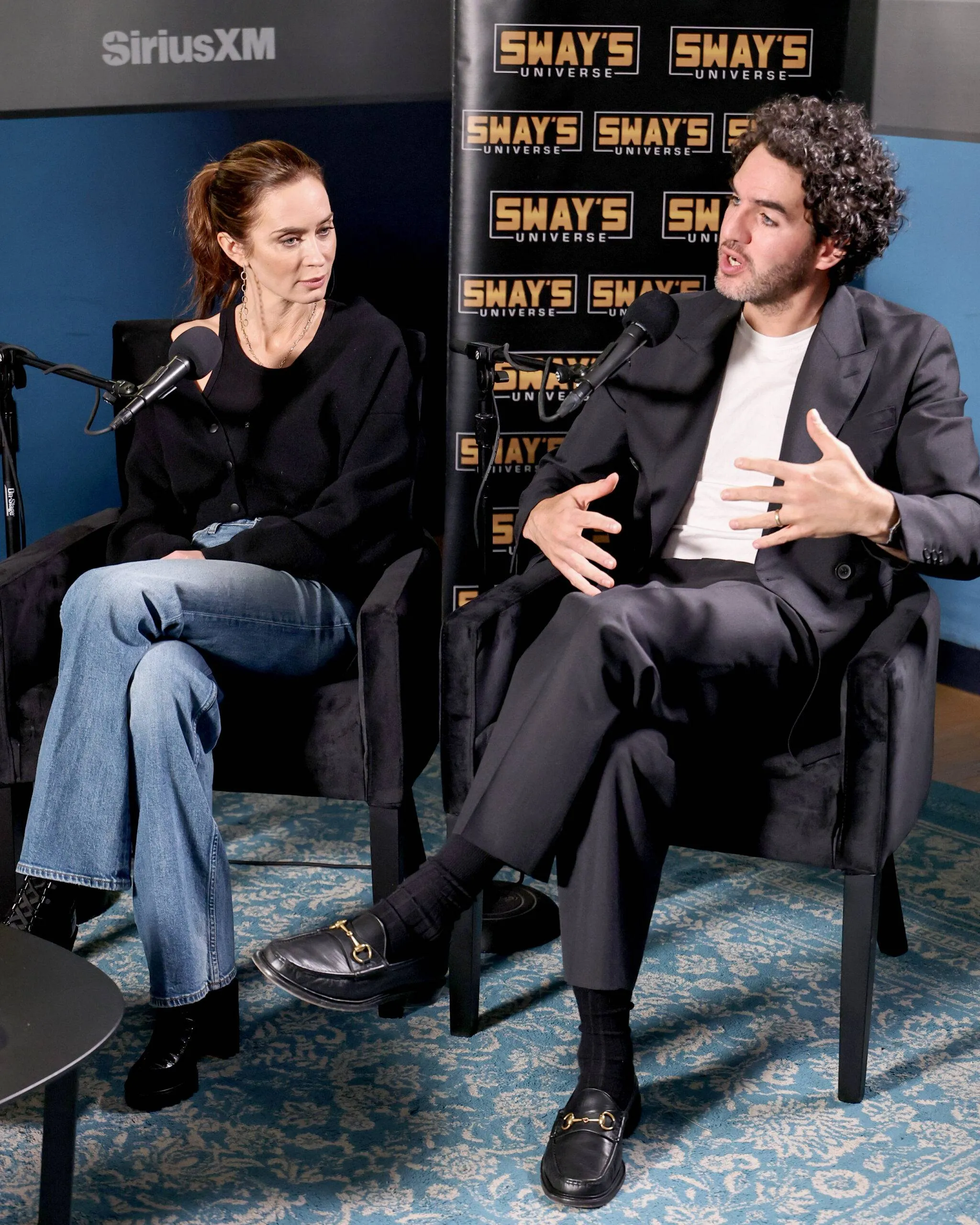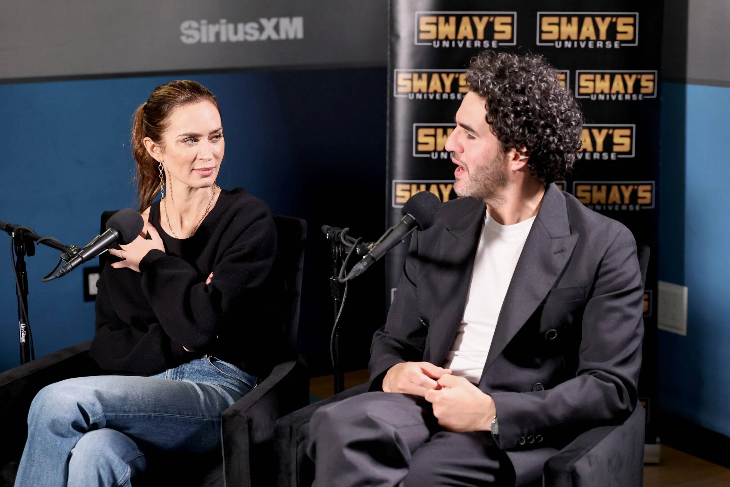 NEW YORK, NEW YORK – OCTOBER 02: (L-R) Emily Blunt and Benny Safdie seem on SiriusXM’s ‘Sway In The Morning With Heather B And Tracy G.’ at SiriusXM Studios on October 02, 2025 in New York Metropolis. (Picture by Jamie McCarthy/Getty Pictures for SiriusXM)