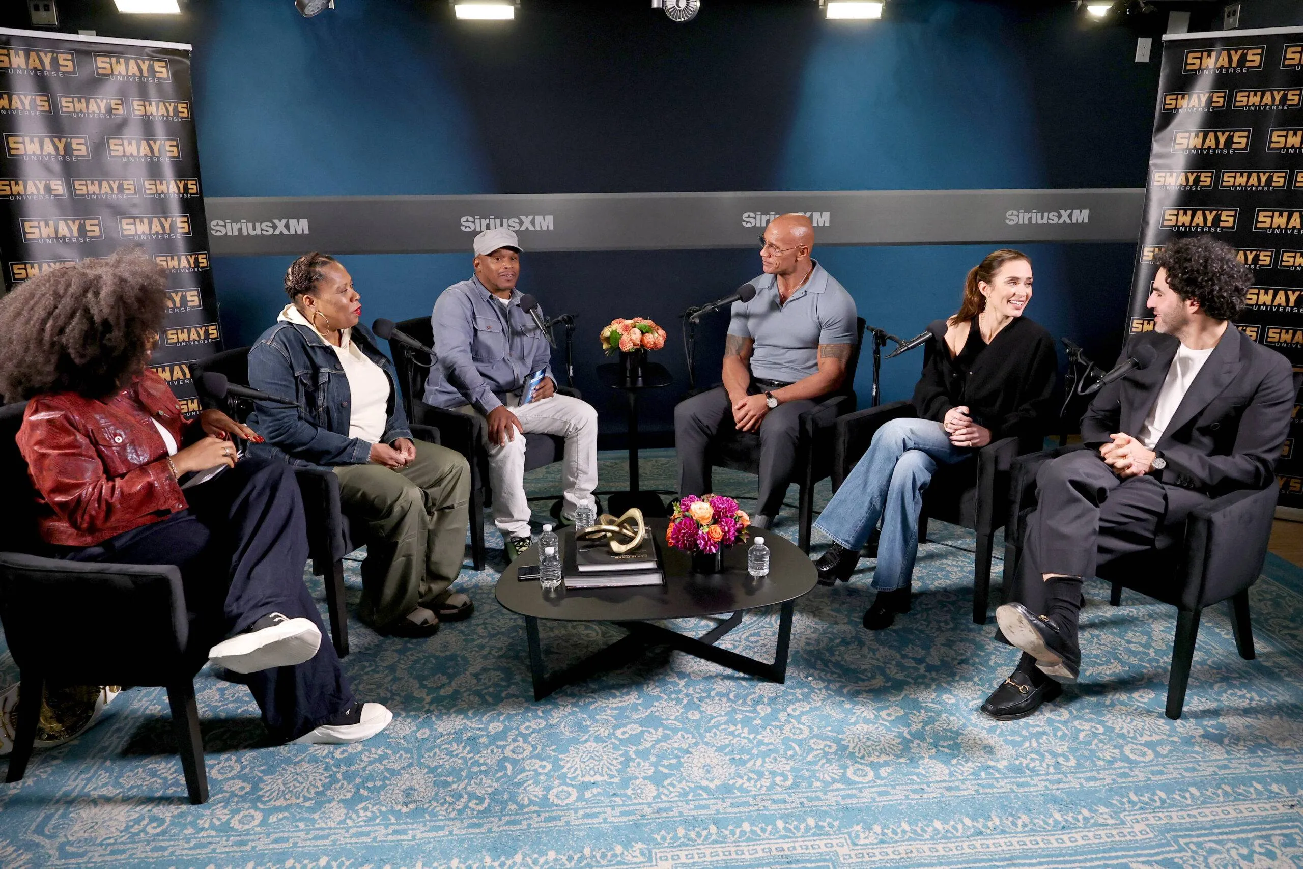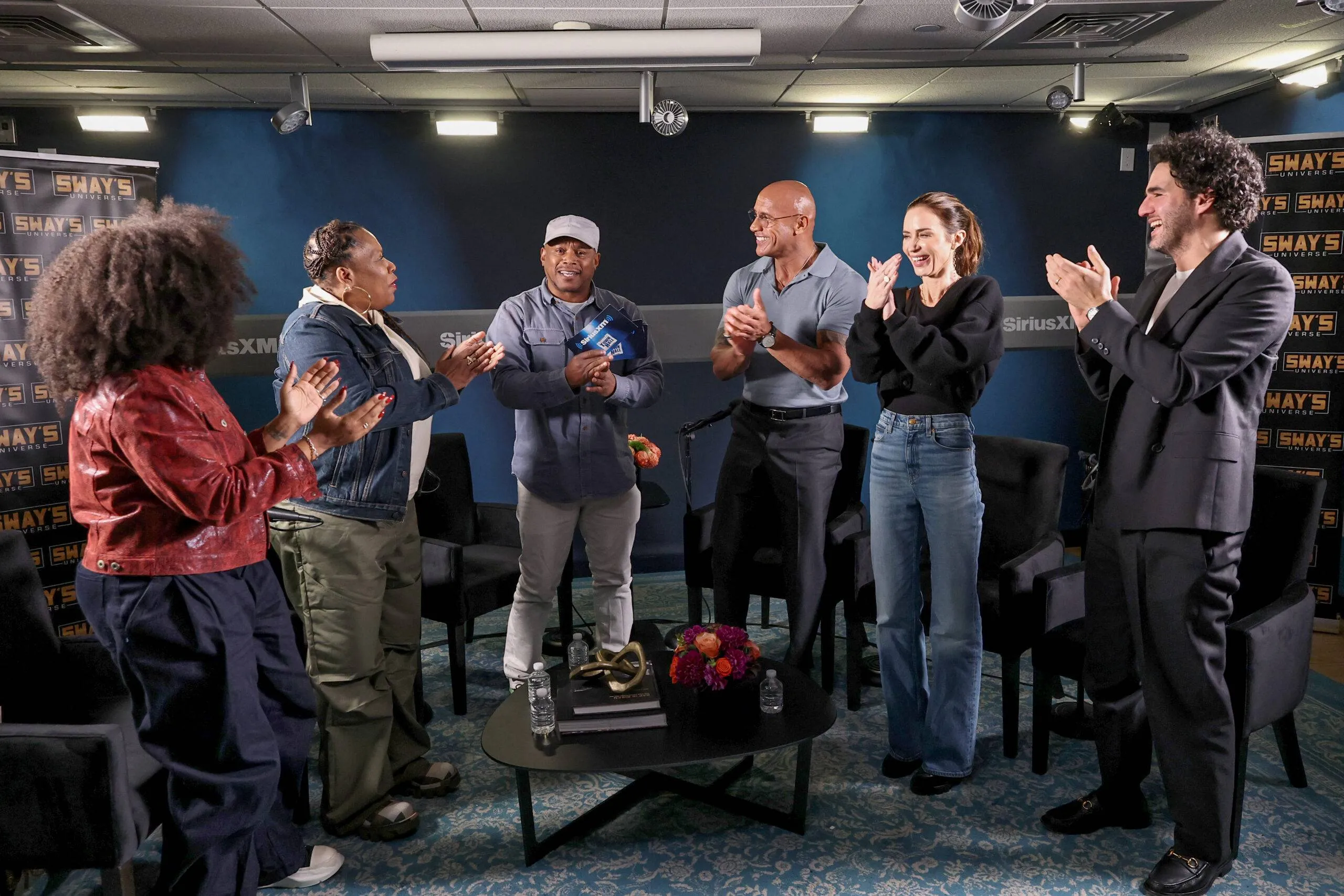 NEW YORK, NEW YORK – OCTOBER 02: (L-R) Tracy G., Heather B, Sway Calloway, Dwayne Johnson, Emily Blunt, and Benny Safdie seem on SiriusXM’s ‘Sway In The Morning With Heather B And Tracy G.’ at SiriusXM Studios on October 02, 2025 in New York Metropolis. (Picture by Jamie McCarthy/Getty Pictures for SiriusXM)