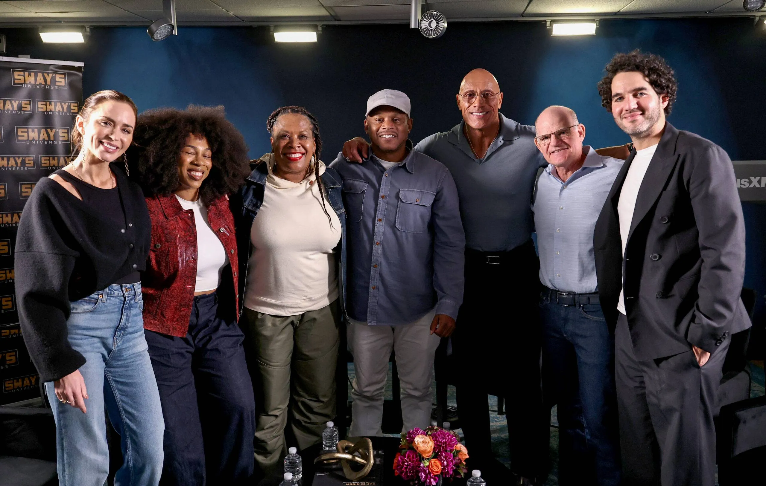 NEW YORK, NEW YORK – OCTOBER 02: (L-R) Emily Blunt, Tracy G., Heather B, Sway Calloway, Dwayne Johnson, Scott Greenstein, and Benny Safdie attend SiriusXM’s ‘Sway In The Morning With Heather B And Tracy G.’ at SiriusXM Studios on October 02, 2025 in New York Metropolis. (Picture by Jamie McCarthy/Getty Pictures for SiriusXM)