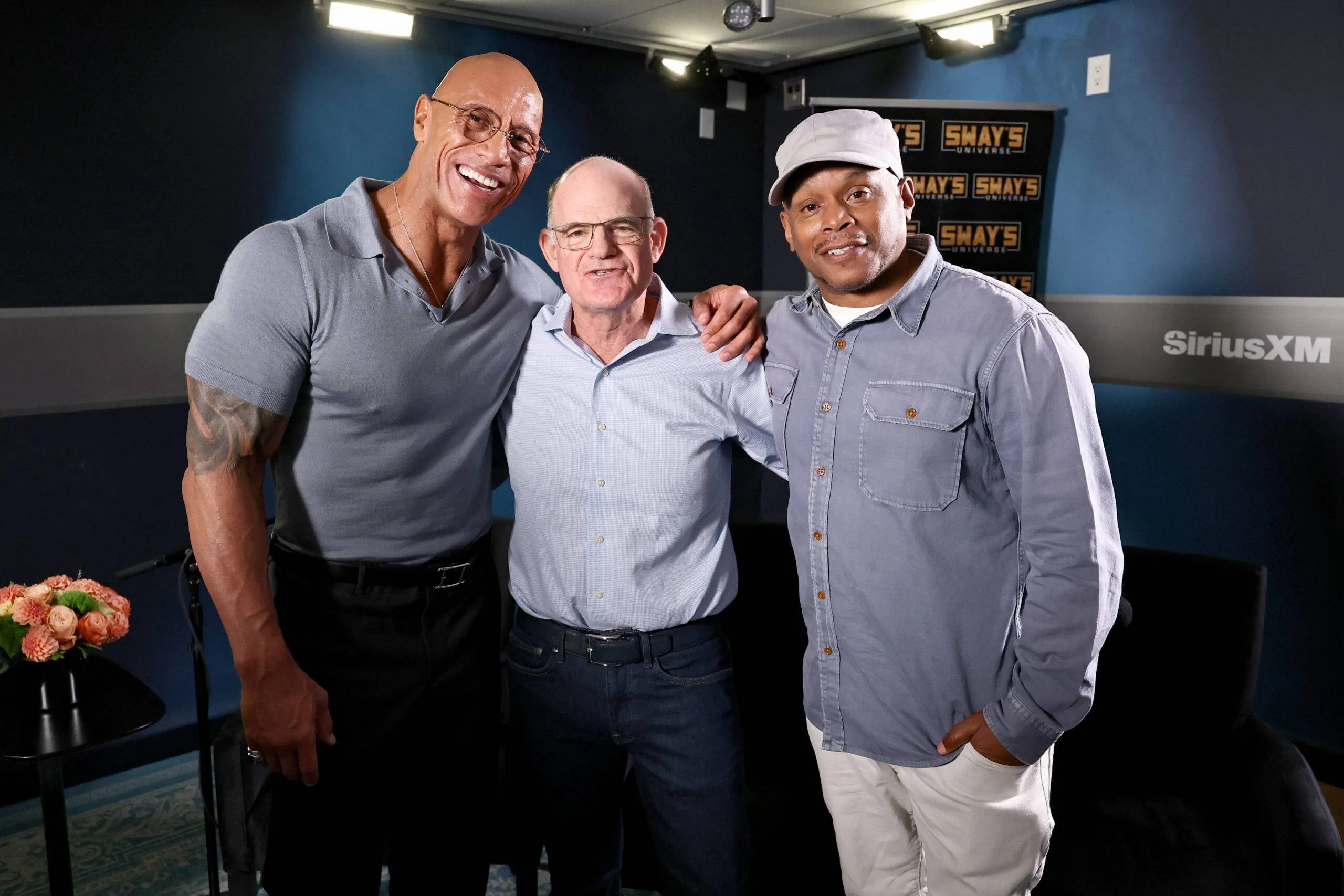 NEW YORK, NEW YORK – OCTOBER 02: (L-R) Dwayne Johnson, Scott Greenstein, and Sway Calloway attend SiriusXM’s ‘Sway In The Morning With Heather B And Tracy G.’ at SiriusXM Studios on October 02, 2025 in New York Metropolis. (Picture by Jamie McCarthy/Getty Pictures for SiriusXM)